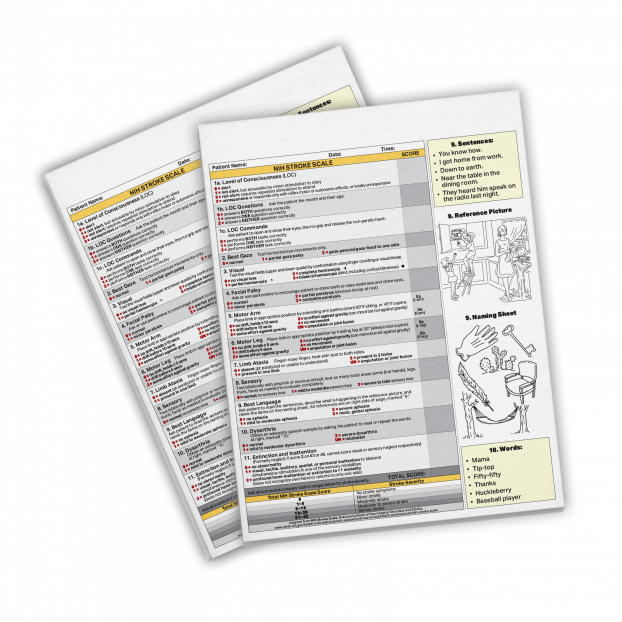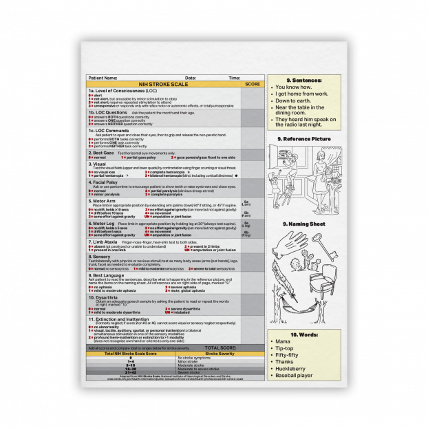 25 individual tear-off sheets of the NIH Stroke Scale that can be stored in crash carts to help assess patients. Each notepad has the complete Stroke Scale with areas to score and tally. Fold the letter size sheet of paper on the dotted line to have a patient only viewable area for text and images section during testing. This single sided scoring sheet can be easily scanned or attach to the patient's medical record.