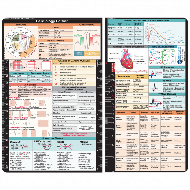 Get our Cardiology Label with the most daily used medical information. Use this reference label to evaluate EKGs, cardiac parameters, murmurs, AV blocks, the criteria for heart failure, cardiac enzymes, anterior cardiac structures and much more. This label can be applied over the top of other labels or used on our ISO full size clipboards.
