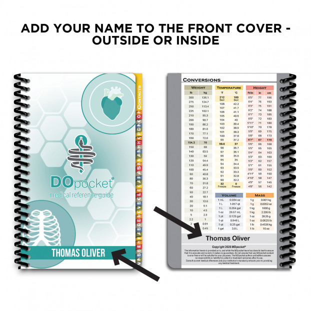 DOpocket is a comprehensive medical reference guide specifically designed to meet the demands of all osteopathic students and residents. This pocket medical reference focuses on osteopathic principles with detailed information on the diagnosis, treatment, and medication guidelines used by today's healthcare professionals. Inside this reference you’ll find easy ways to access information with tab specific chapters to allow quick medical referencing and easy pocket storage to take on all your rotations.