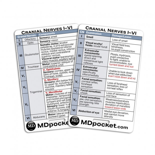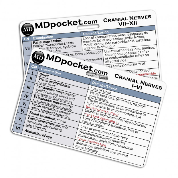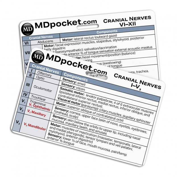 The Rapid ID Cranial Nerves set lists out each cranial nerve function and examination. Use these cards to look for cranial nerve lesions or damage associated with each nerve. Rapid IDs are quick medical references used by healthcare professionals that can be carried behind your ID badge. Have a quick and easy way to have medial information at your fingertips.