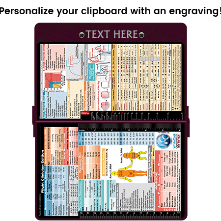 WhiteCoat® Clipboard Flight Medic Edition is an essential resource for flight crews responding to emergencies. Use this quick medical reference to diagnose patient abnormalities in vitals, oxygenation, burns, and more. You can now write down essential patient information with this one-of-a-kind patented full size folding clipboard with other medical information on burns (rule of nines, body surface area), cardiac pressor use, vent management, using neuromuscular blocking agents, glasgow coma scale, drip calculations and shock index.