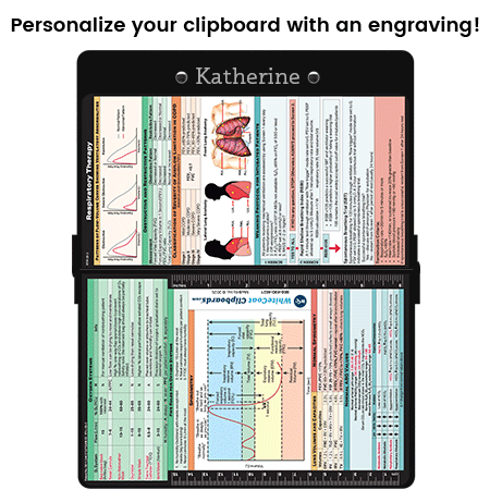 Full-size medical pocket clipboard from WhiteCoat Clipboards. Unique design allows you to fold the clipboard in half for storage in your pocket. Made of lightweight aluminum with the ability to carry 30 pieces of paper without a crease while at the same time securing all your medical information inside. Carry patient respiratory assessment forms, ventilator logs, medication lists, and all your documentation in a HIPAA secure clipboard. The clipboard also functions as a quick medical reference guide with detailed day-to-day information such as spirometry assessment with COPD criteria, acid base determination and expected compensation, ventilator weaning and Rapid Swallow Breathing Index (RSBI), oxygen systems and flow rates.