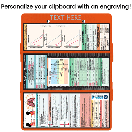 Full-size medical pocket clipboard from WhiteCoat Clipboards® with a unique trifold design for storage in even the smallest of pockets, white coats, and scrubs. Made of lightweight aluminum with the ability to carry 30 pieces of paper without a crease while at the same time securing all your medical information inside. Carry patient respiratory assessment forms, ventilator logs, medication lists, and all your documentation in a HIPAA secure clipboard. The clipboard also functions as a quick medical reference guide with detailed day-to-day information such as spirometry assessment with COPD criteria, acid base determination with expected compensation, ventilator weaning, Rapid Swallow Breathing Index (RSBI), oxygen systems, and flow rates. To see all the medical information on this clipboard, hover over the images above to display high resolution details.