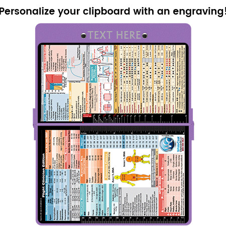 WhiteCoat® Clipboard Flight Medic Edition is an essential resource for flight crews responding to emergencies. Use this quick medical reference to diagnose patient abnormalities in vitals, oxygenation, burns, and more. You can now write down essential patient information with this one-of-a-kind patented full size folding clipboard with other medical information on burns (rule of nines, body surface area), cardiac pressor use, vent management, using neuromuscular blocking agents, glasgow coma scale, drip calculations and shock index.