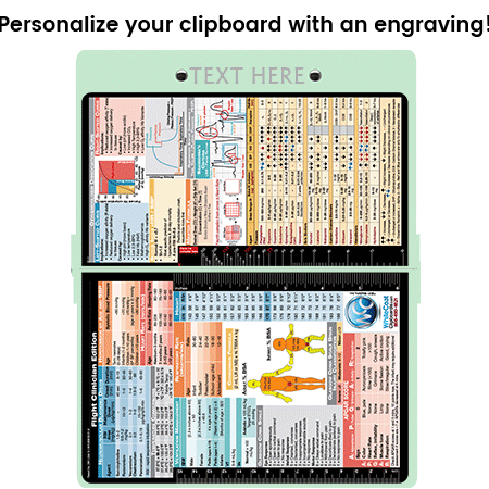 WhiteCoat® Clipboard Flight Medic Edition is an essential resource for flight crews responding to emergencies. Use this quick medical reference to diagnose patient abnormalities in vitals, oxygenation, burns, and more. You can now write down essential patient information with this one-of-a-kind patented full size folding clipboard with other medical information on burns (rule of nines, body surface area), cardiac pressor use, vent management, using neuromuscular blocking agents, glasgow coma scale, drip calculations and shock index.