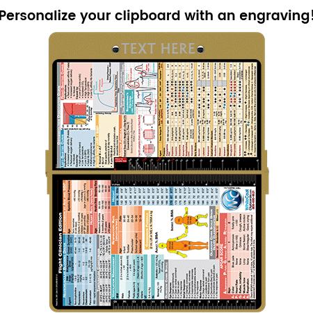 WhiteCoat® Clipboard Flight Medic Edition is an essential resource for flight crews responding to emergencies. Use this quick medical reference to diagnose patient abnormalities in vitals, oxygenation, burns, and more. You can now write down essential patient information with this one-of-a-kind patented full size folding clipboard with other medical information on burns (rule of nines, body surface area), cardiac pressor use, vent management, using neuromuscular blocking agents, glasgow coma scale, drip calculations and shock index.