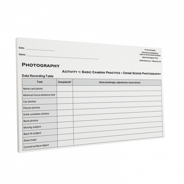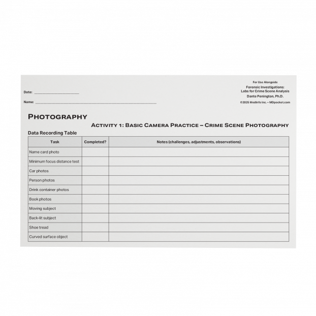 This book provides a structured, step-by-step set of instructions for 19 introductory forensic investigation labs focused on crime scene analysis. Labs included focus on the core competencies for field-note standards, evidence packaging, crime scene sketching, forensic photography, bloodstain pattern analysis, impressions, and bullet-trajectory reconstruction. This lab book includes extra pages for notes and graph paper to outline additional information. A corresponding notepad is included for data collection and analysis, which students can tear off and turn in for a grade.